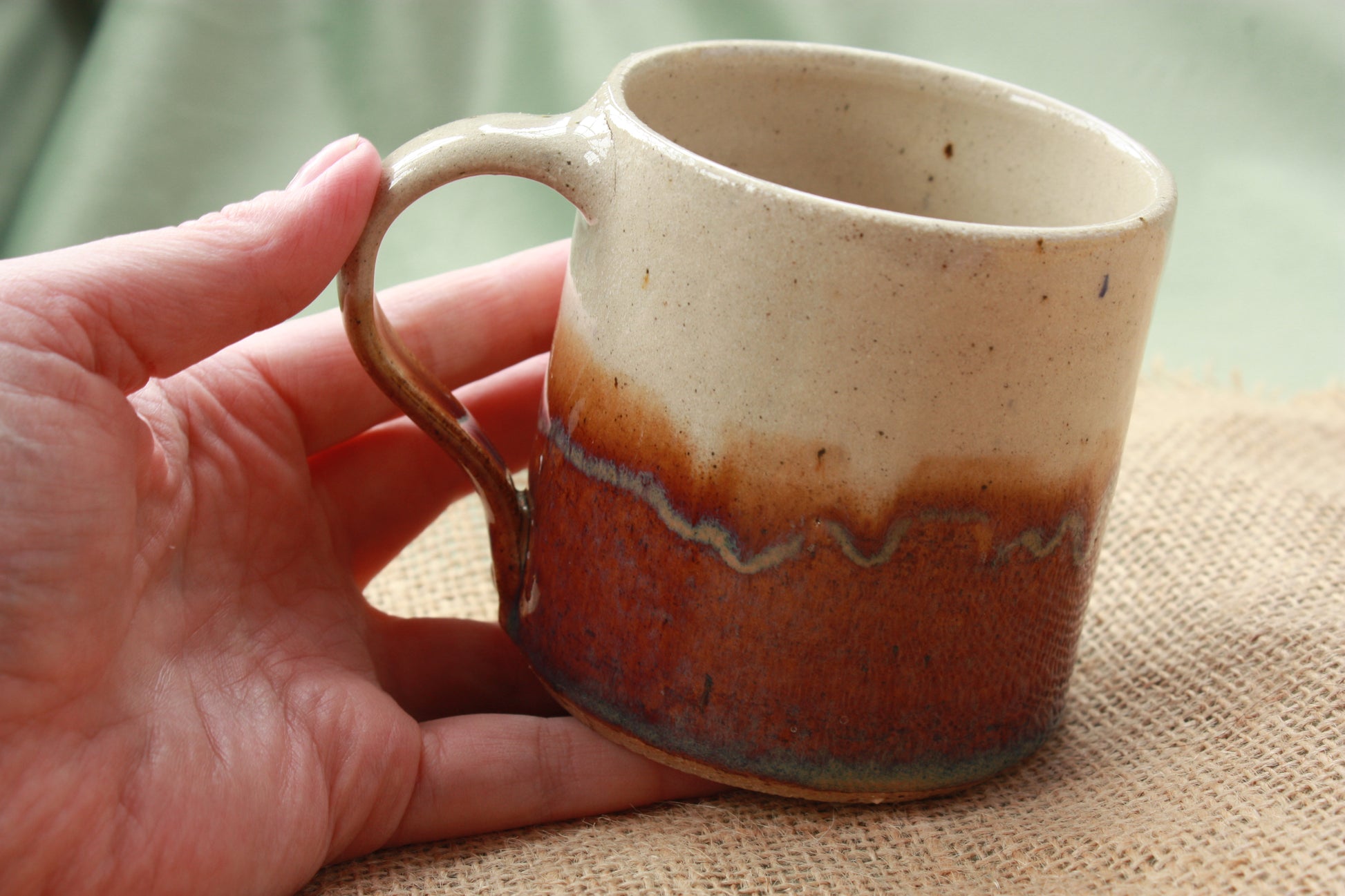 This beautifully crafted taper cup features a rich brown glaze that reveals stunning depth and textural variation with every angle. A distinctive tideline emerges where the brown meets the clear glaze above, creating visual interest and movement across the surface. Some admirers notice subtle purple undertones within the glaze, adding an extra layer of sophistication. The speckled clay body complements the glaze perfectly, giving this piece authentic character and warmth. Perfect for your daily tea or coffee ritual, this cup brings artisanal charm to any table.